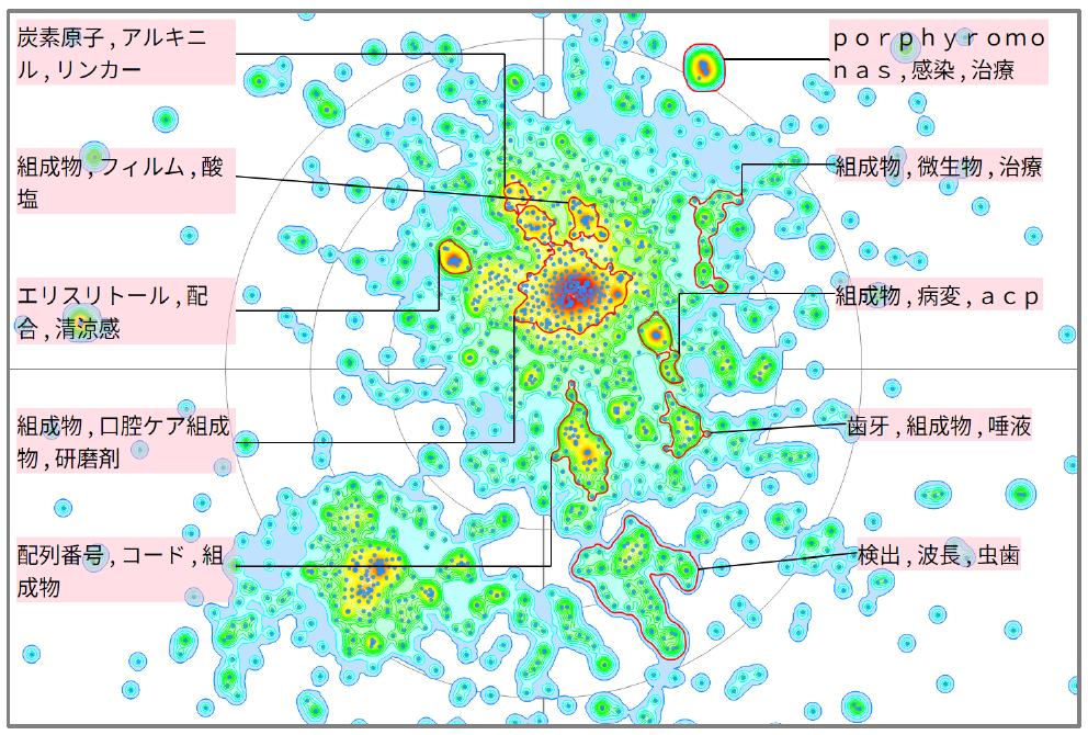 俯瞰図上では、研磨性シリカを基盤とした歯磨剤組成の改良に注力する【組成物 ,口腔ケア組成物 ,研磨剤】領域(259件)が中心付近で大きな領域として存在しています。その他、中心から左側には甘味・清涼剤の配合最適化、粘結剤や粒子径制御による使用感改善と保存性に関する【エリスリトール ,配合 ,清涼感】なども見られます。